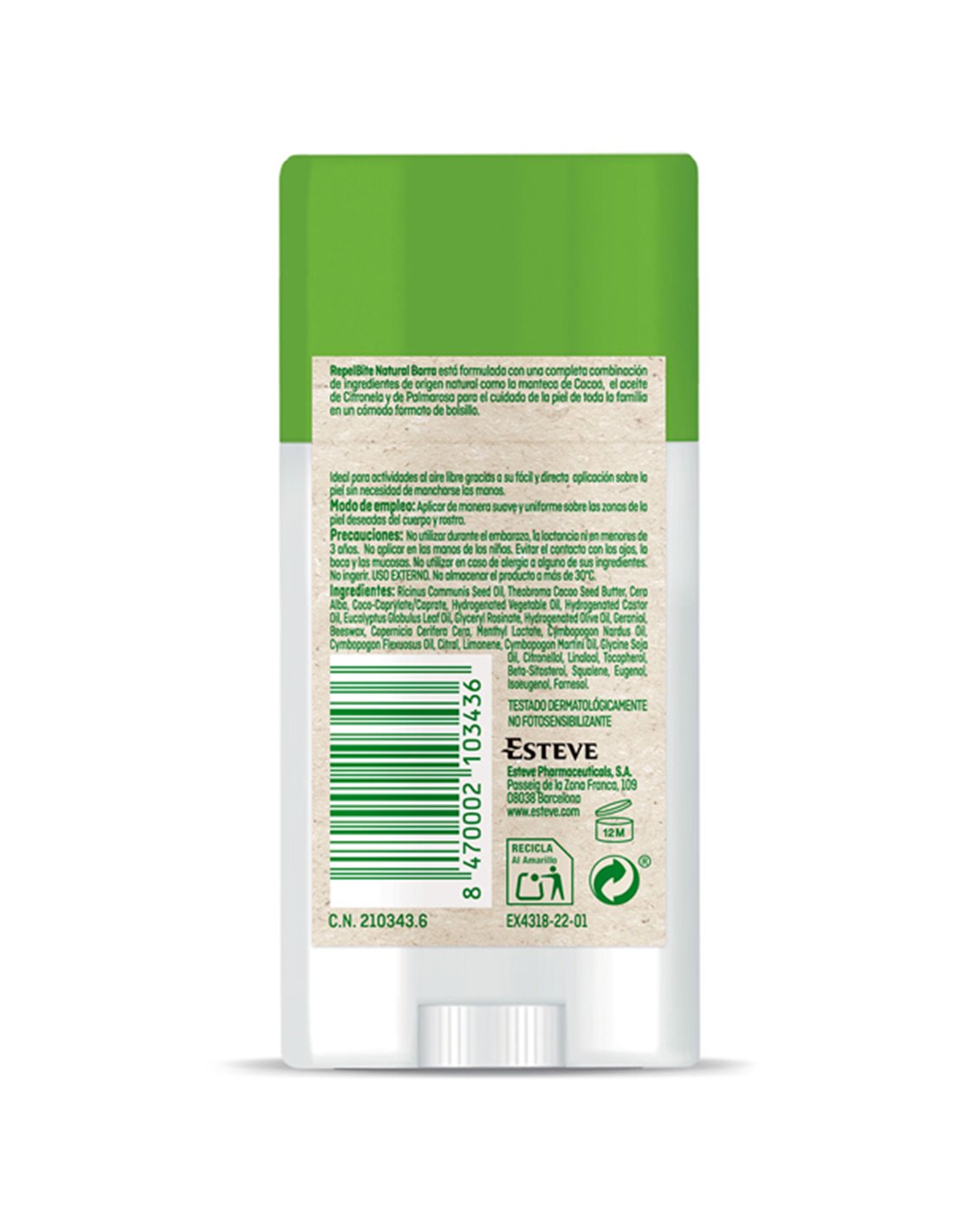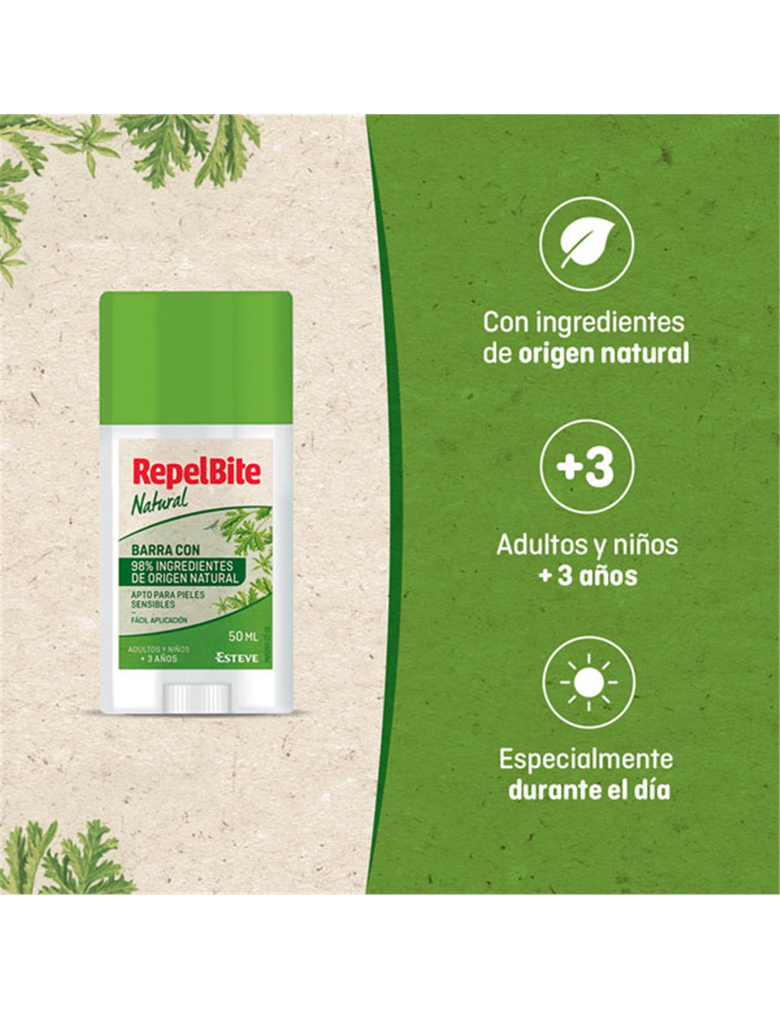 RepelBite Natural Barra 50 ml es un repelente de insectos con una fórmula natural que protege tu piel de las picaduras de mosquitos y otros insectos. Su formato barra facilita su aplicación, permitiendo un control preciso y evitando el contacto con las manos. Gracias a sus ingredientes de origen natural, como el aceite de citronela y el aceite de eucalipto, este producto proporciona una protección efectiva sin necesidad de productos químicos. Es ideal para usar en exteriores, especialmente en zonas con alta presencia de insectos, y adecuado para toda la familia. Aplicar generosamente en las zonas expuestas de la piel para una protección continua.